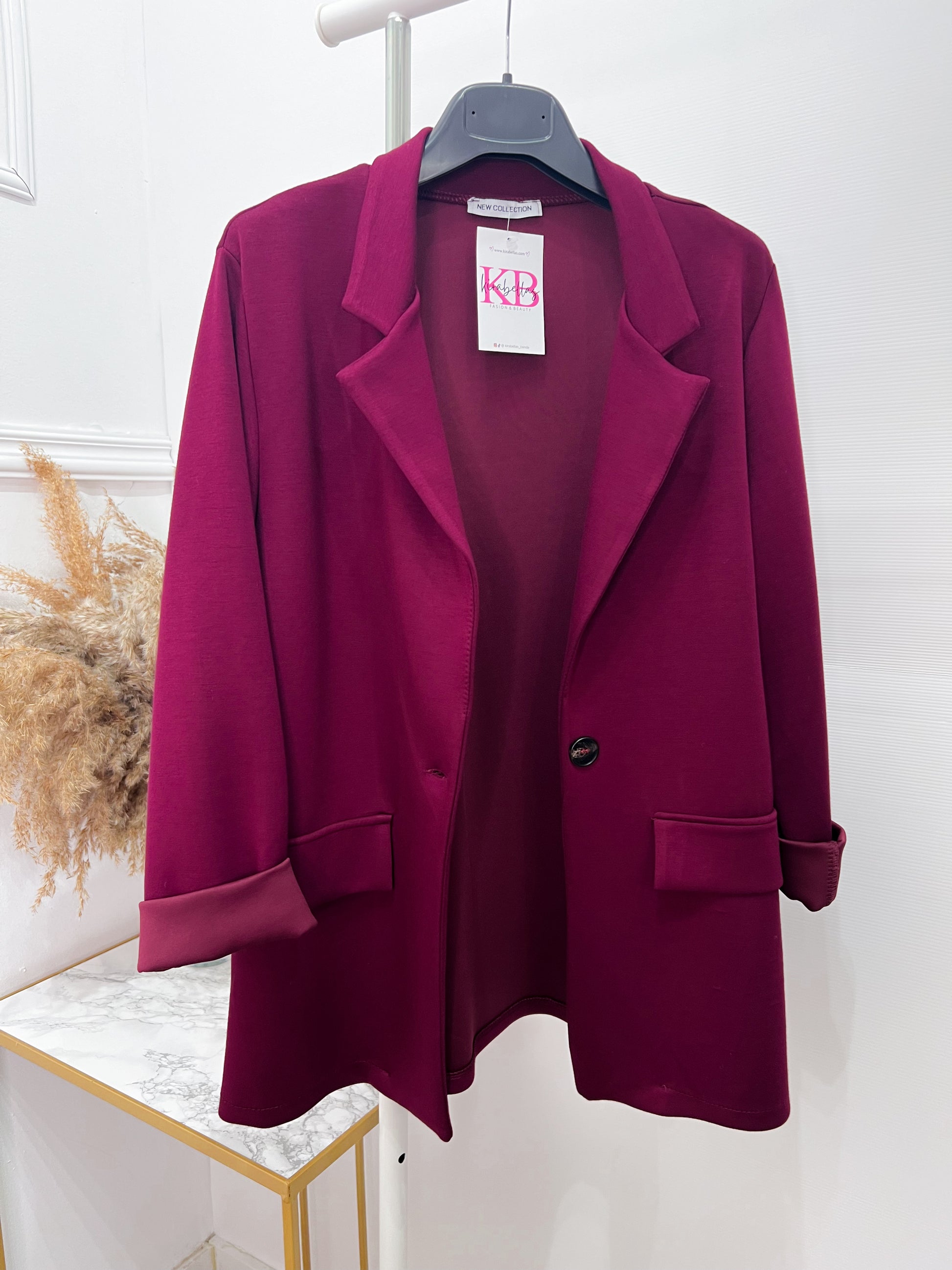 Americana de manga larga, de tela de punto, lleva eslastico y se adapta super bien, es muy comoda de llevar y un tacto suave, tiene muy buena calidad, en color burdeos, el color de la temporada.