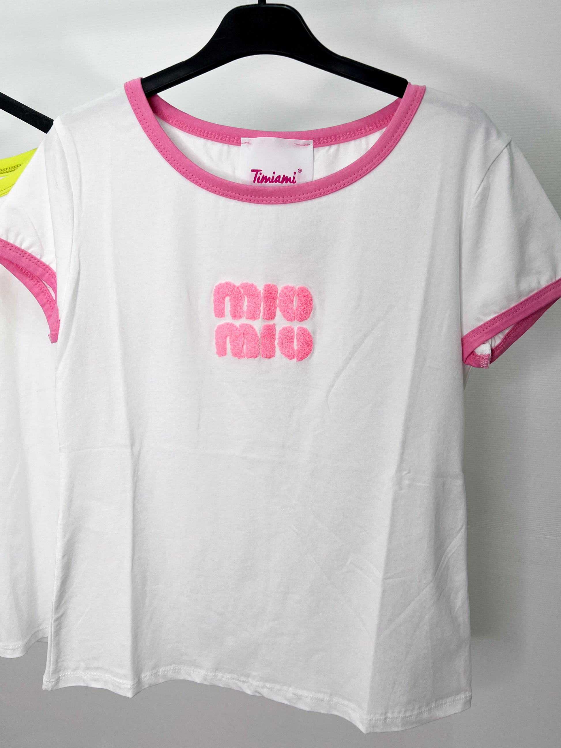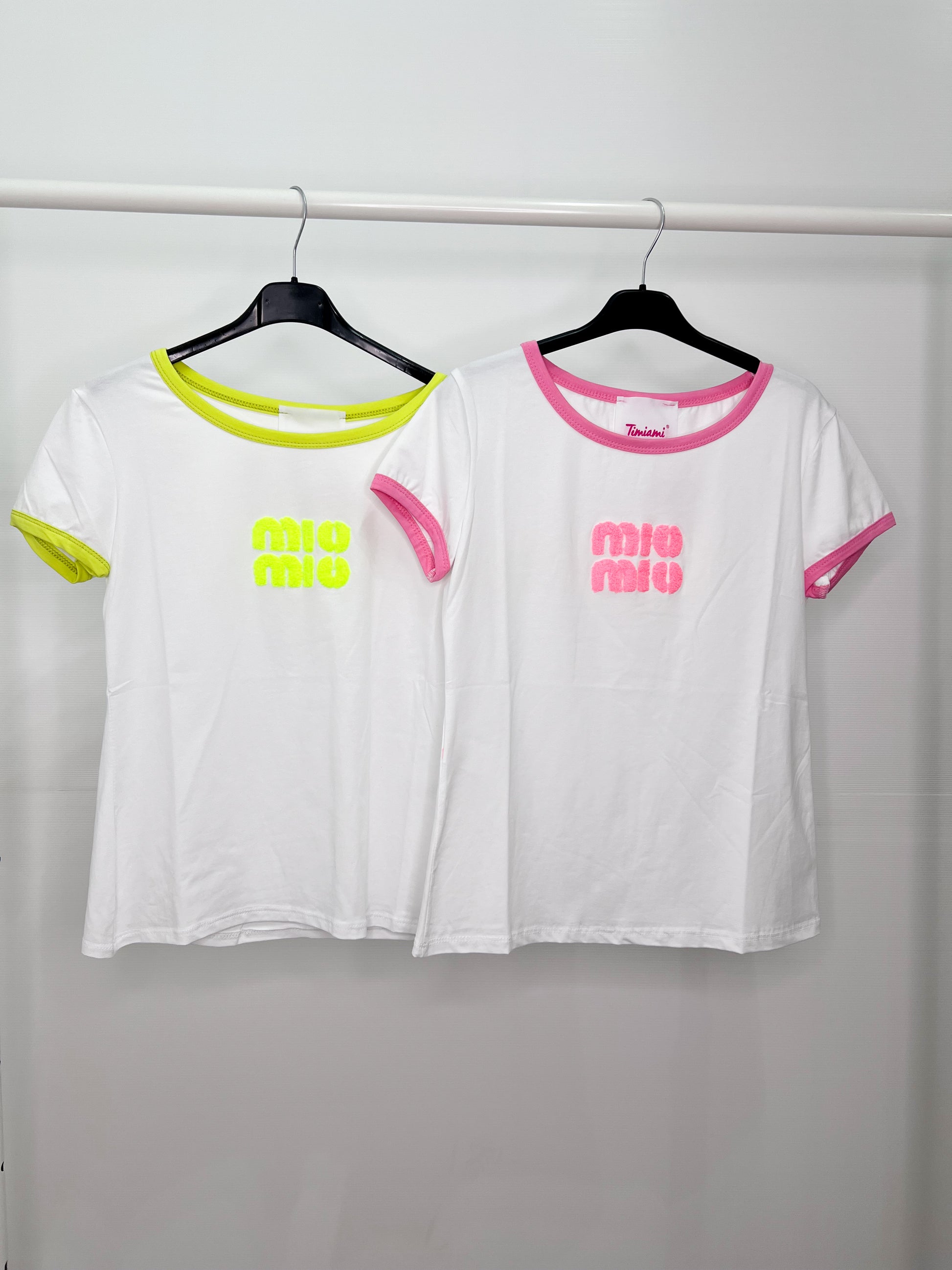 camiseta con detalles de los bordes de las mangas y el cuello redondo en colores fluor, y bordado en el centro, es elástica por lo que se adapta muy bien.
