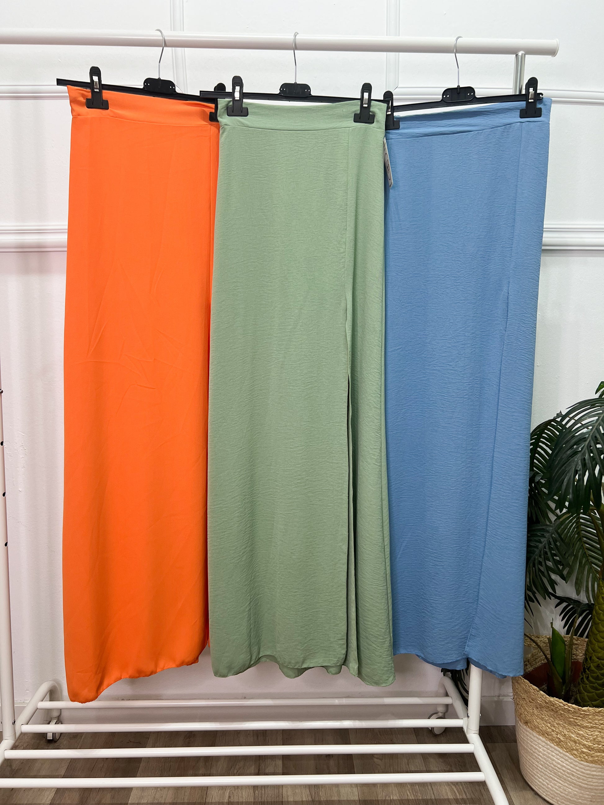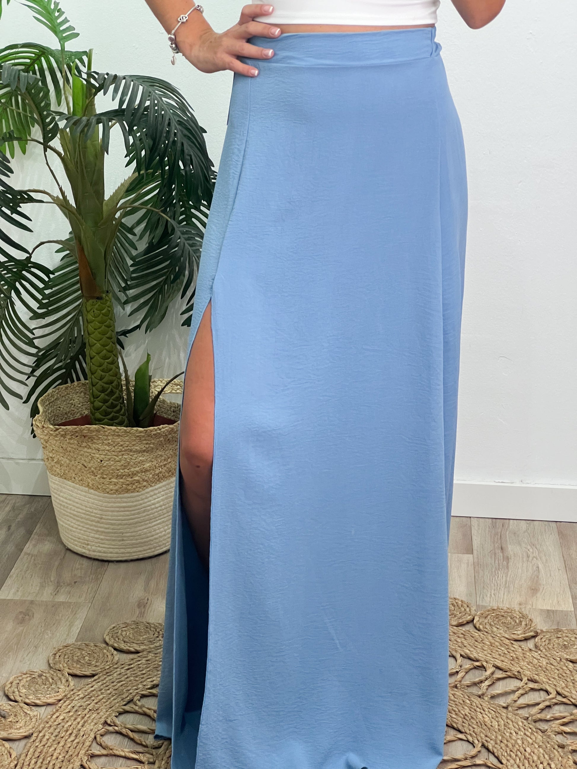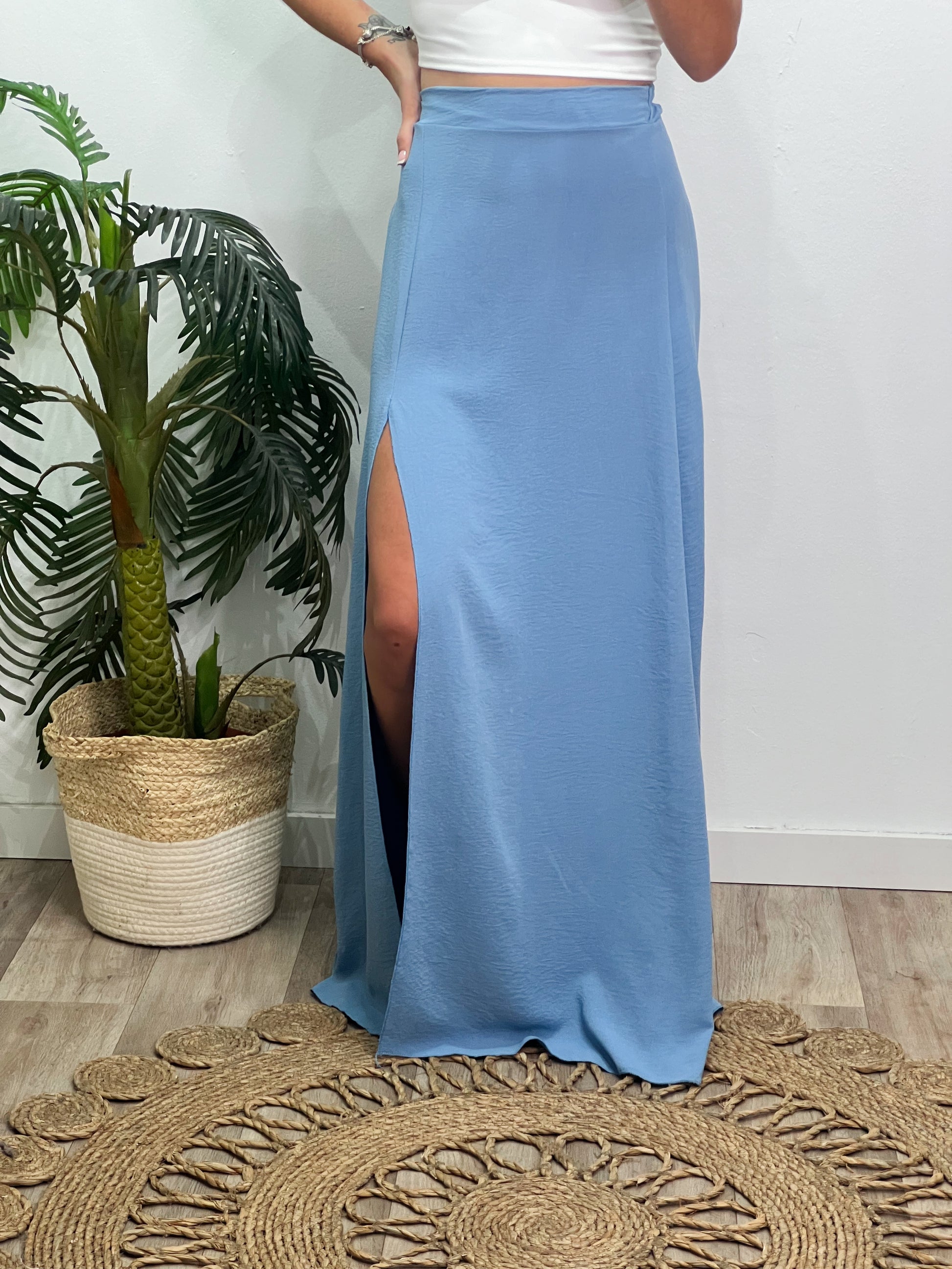 Falda larga de tela fluida con apertura en la pierna, la falda es bastante larga y lleva gominola en la cintura.
