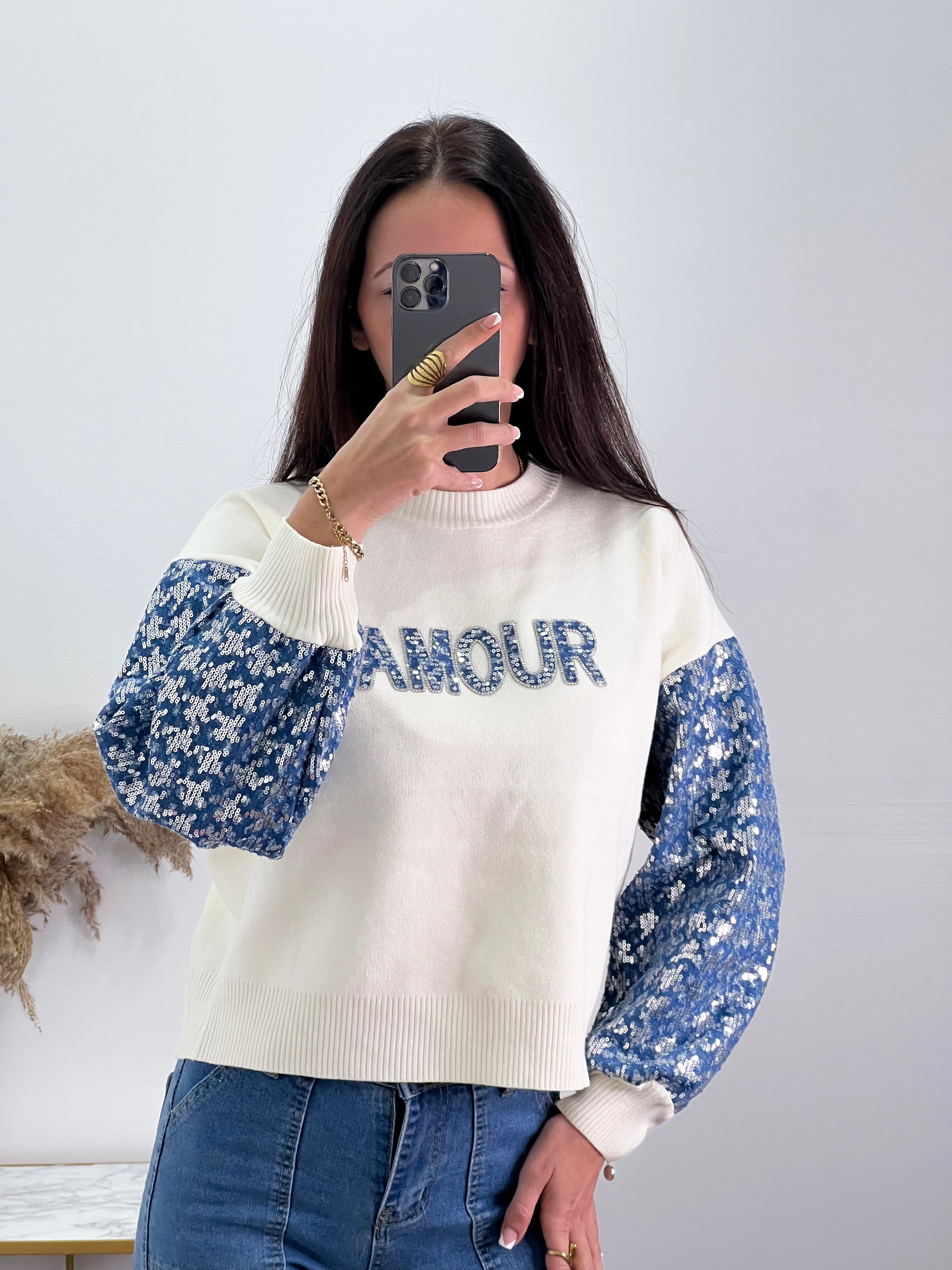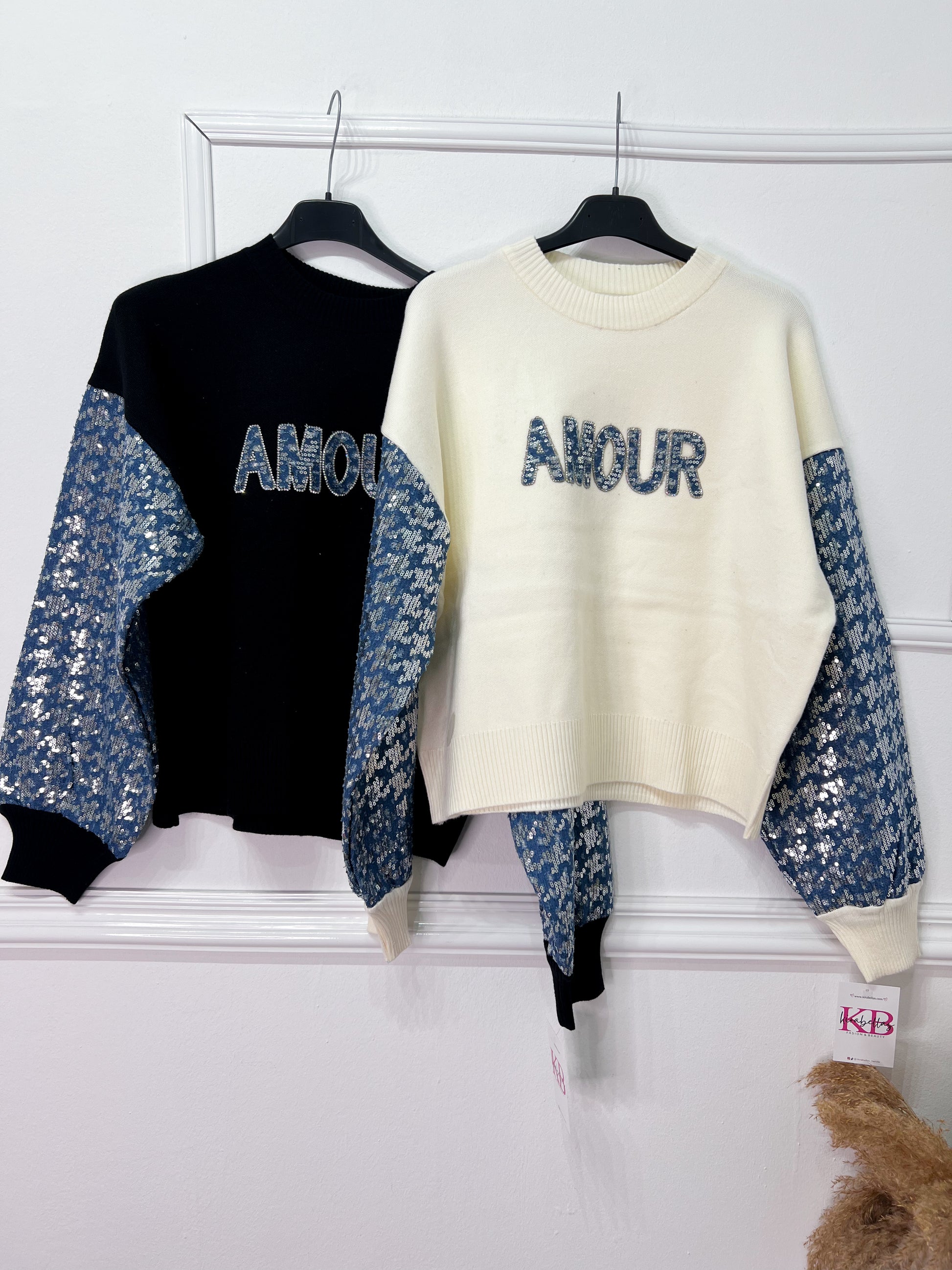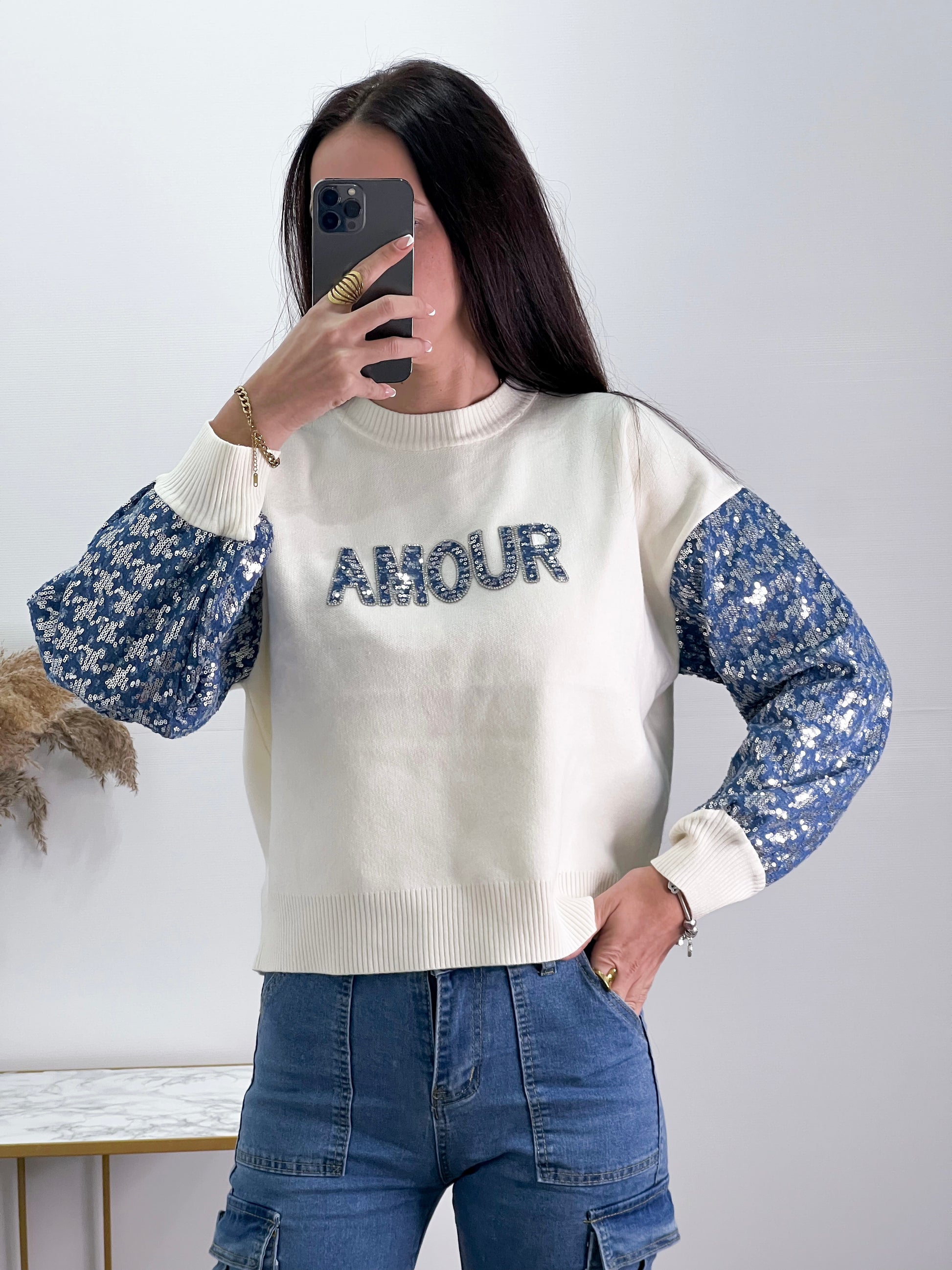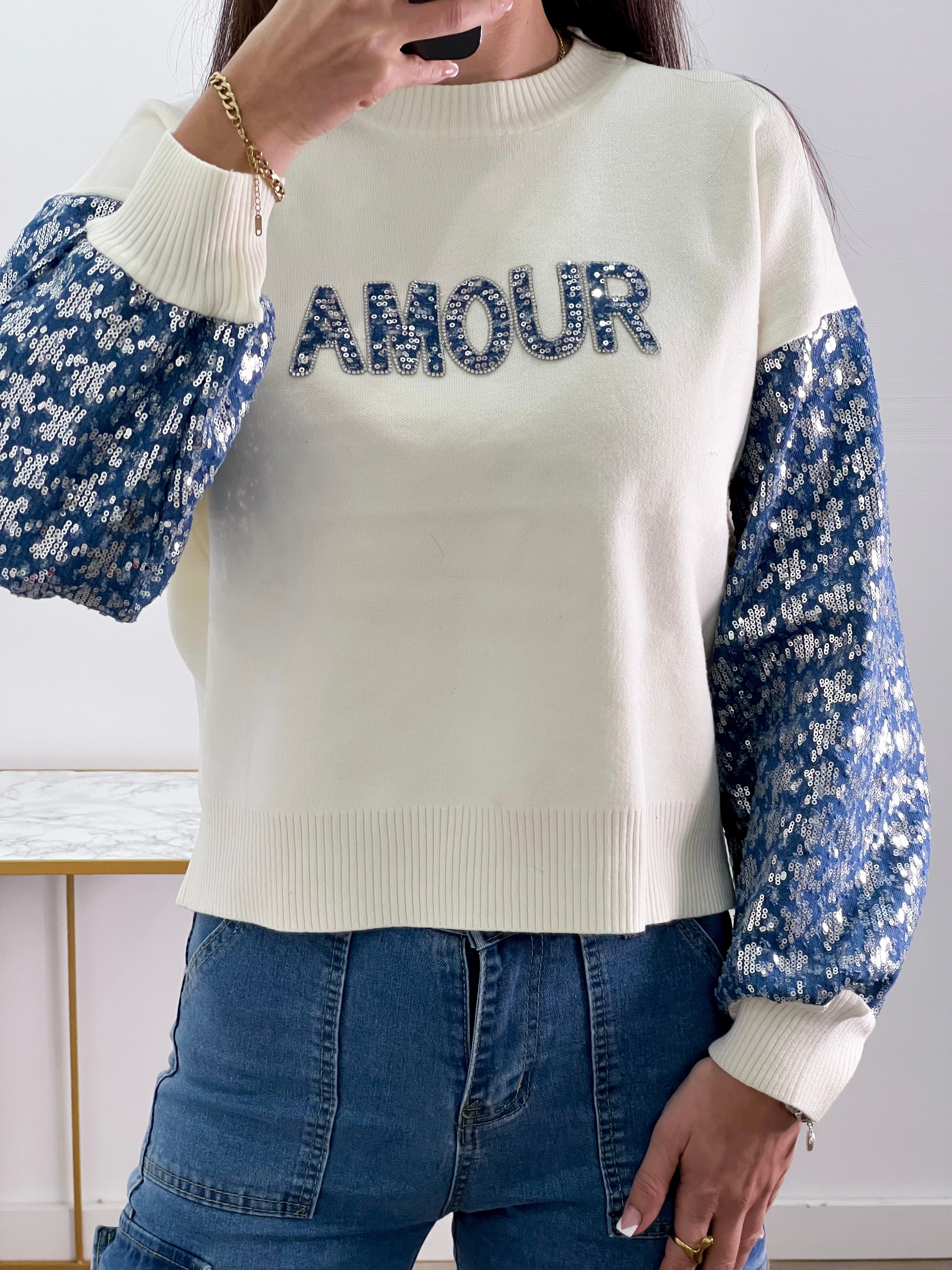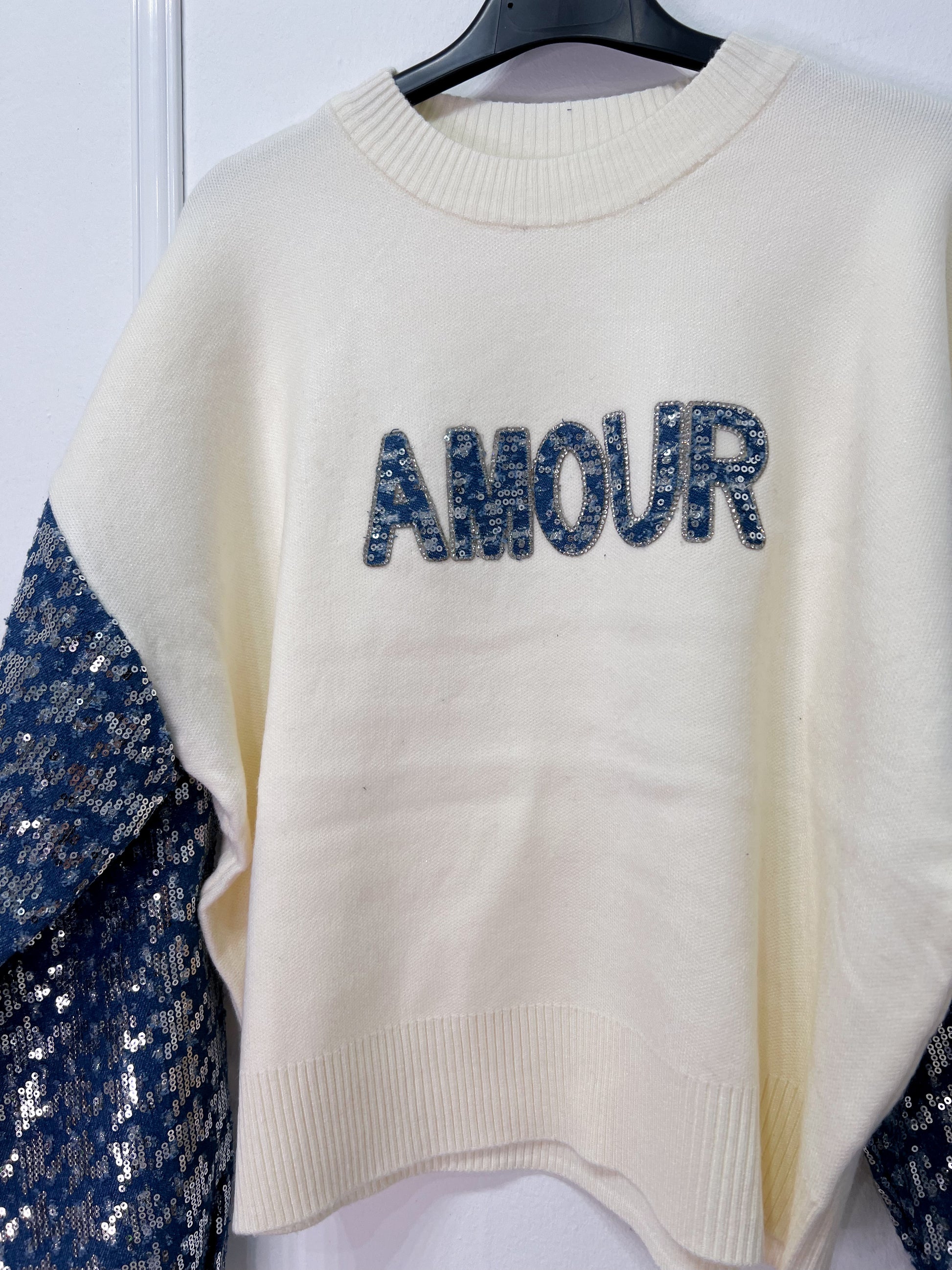 Jersey Amour de punto grueso, súper calentito, con detalle de letras amour en tejido vaquero con lentejuelas, mangas también en tejido vaquero con lentejuelas, las lentejuelas no picas ya que en las mangas lleva forrito.