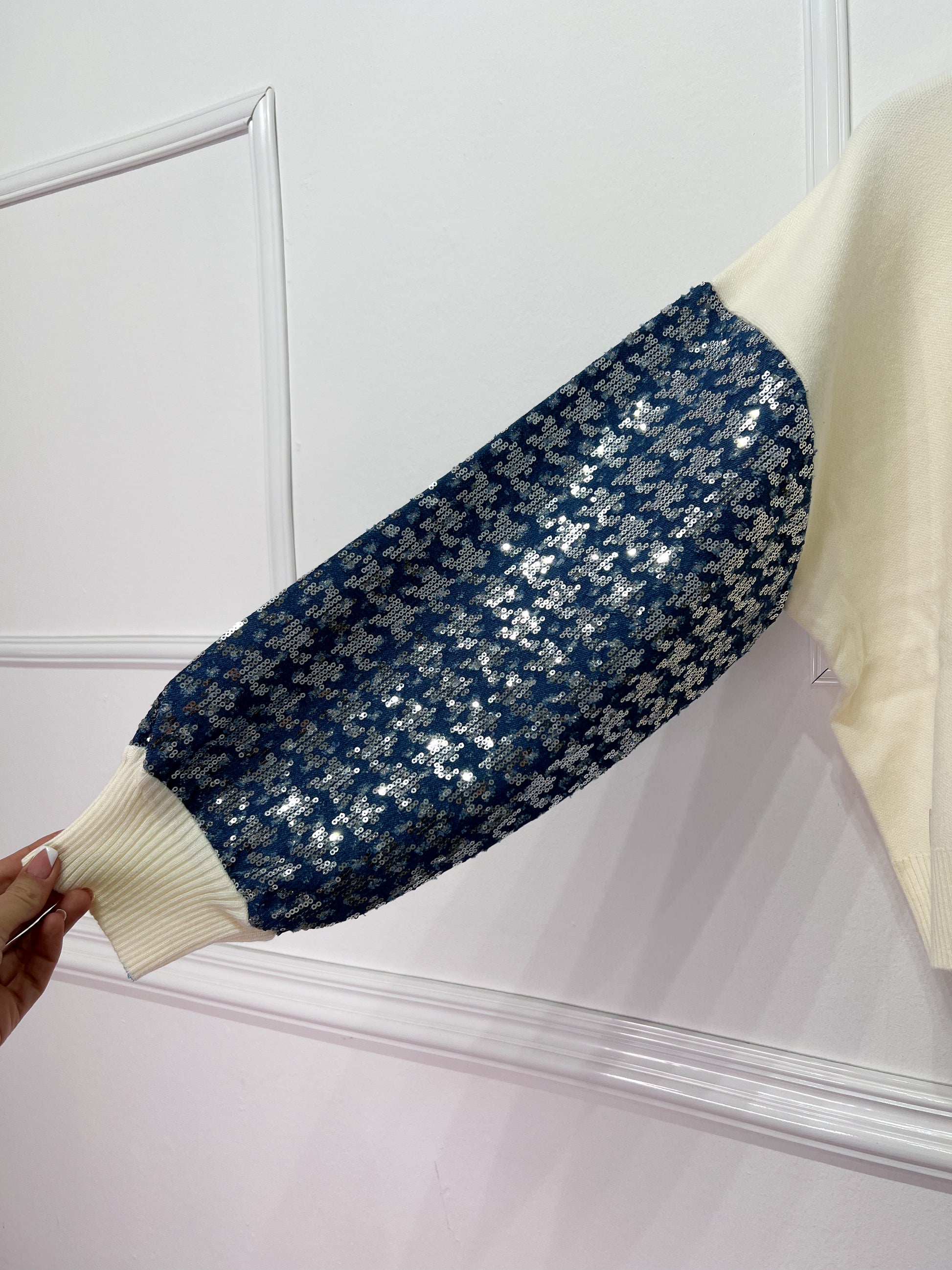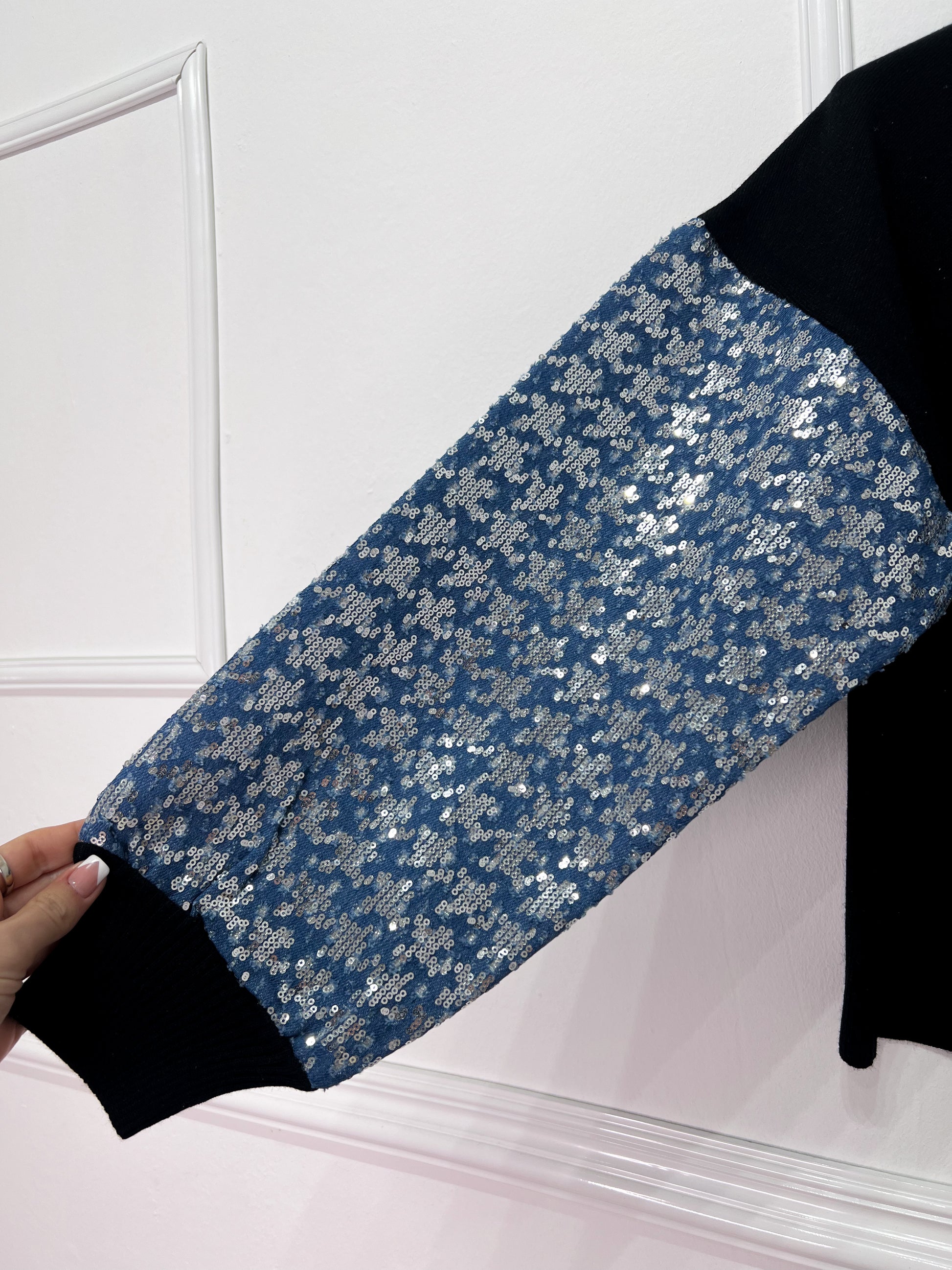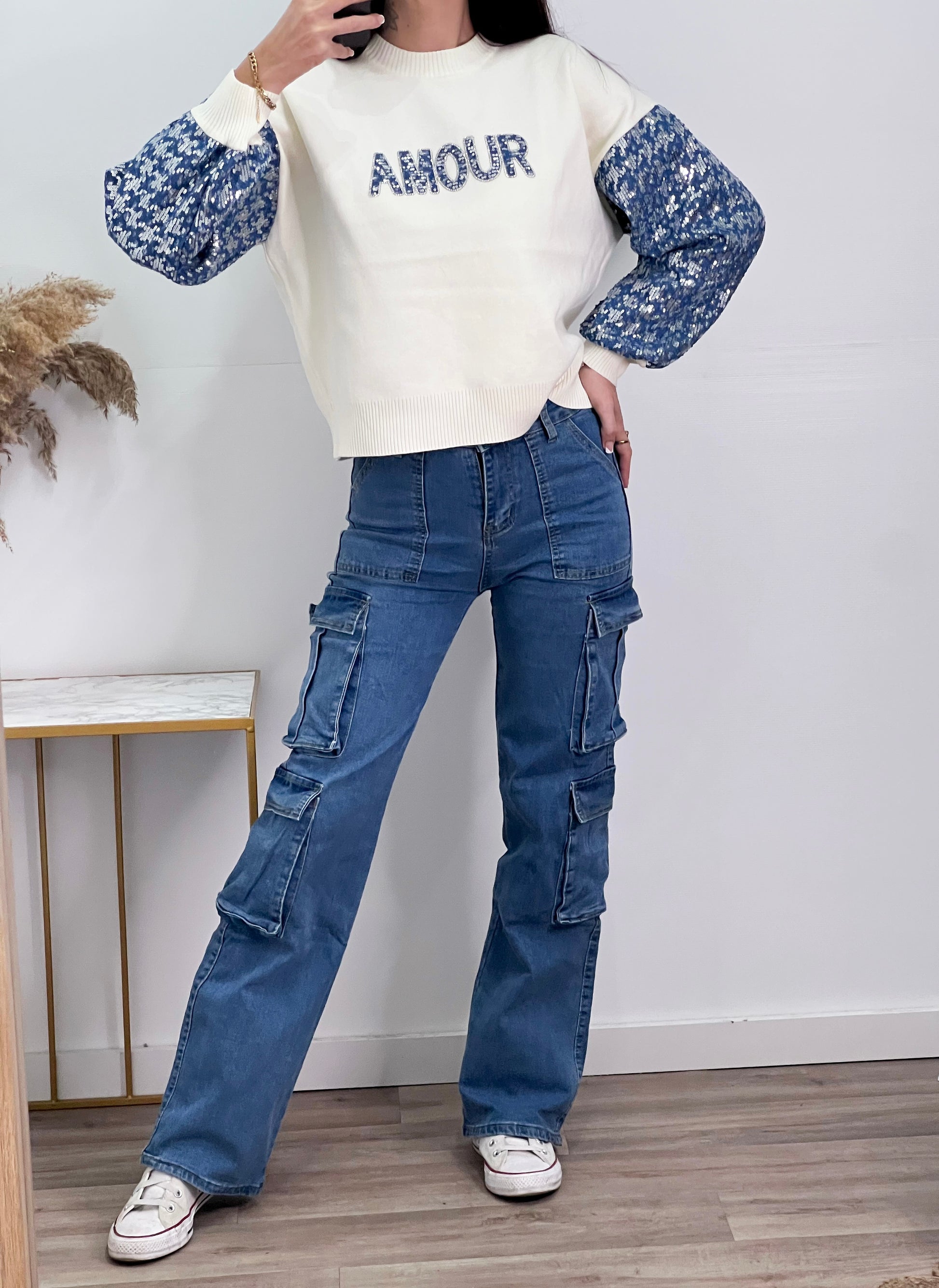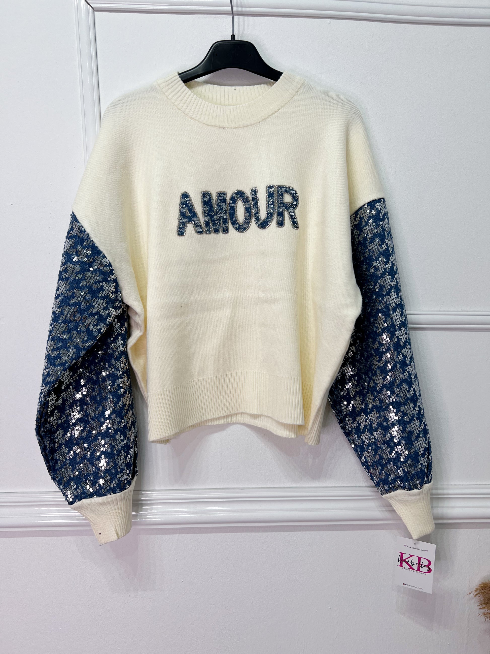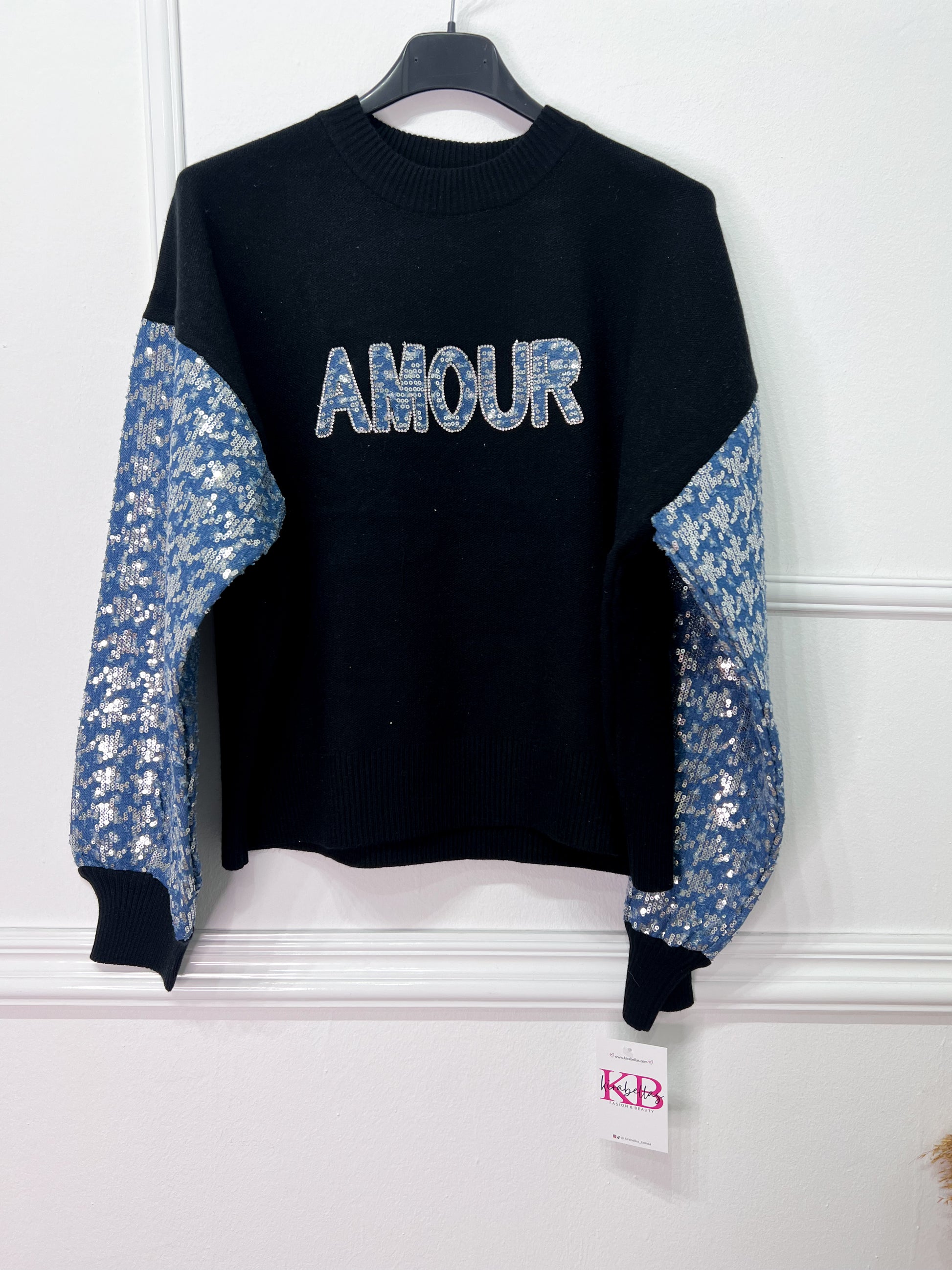 Jersey Amour de punto grueso, súper calentito, con detalle de letras amour en tejido vaquero con lentejuelas, mangas también en tejido vaquero con lentejuelas, las lentejuelas no picas ya que en las mangas lleva forrito.