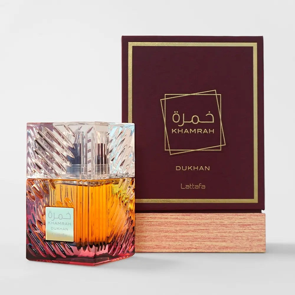 Khamrah Dukhan de Lattafa Perfumes es una fragancia de la familia olfativa Oriental para Hombres. Esta fragrancia es nueva. Khamrah Dukhan se lanzó en 2025. Las Notas de Salida son especias, pimiento morrón y mandarina; las Notas de Corazón son incienso, ládano, flor de azahar del naranjo y pachulí; las Notas de Fondo son tabaco, praliné, ámbar, benjuí y haba tonka.