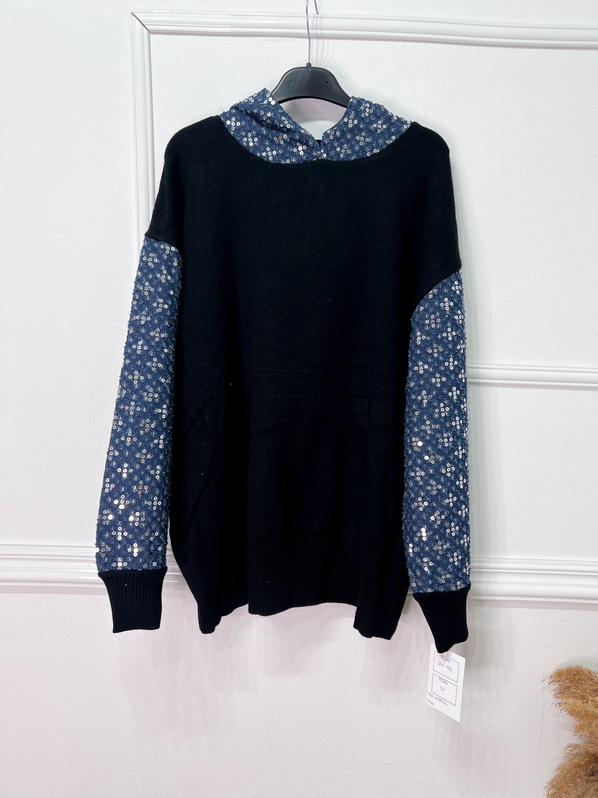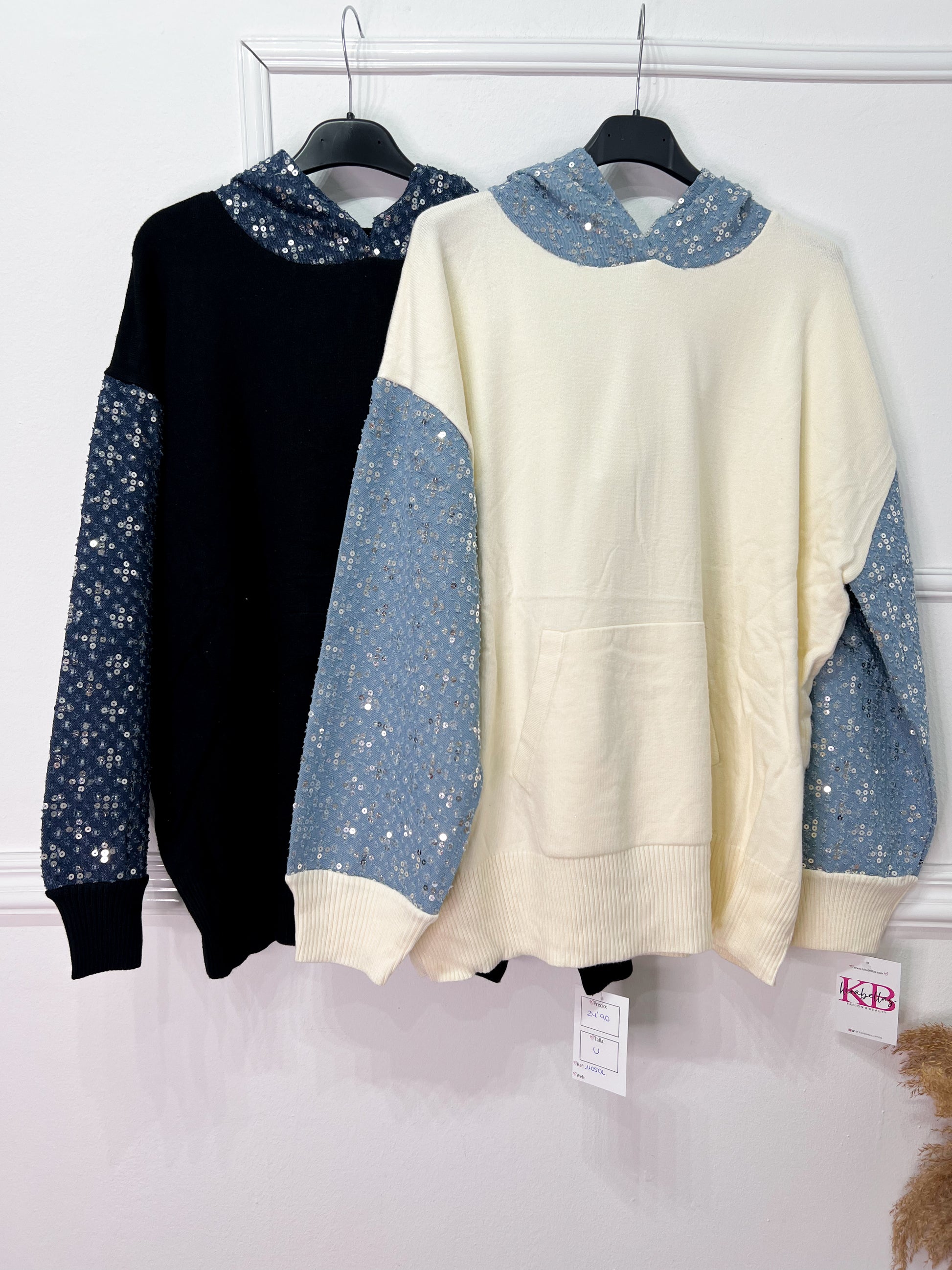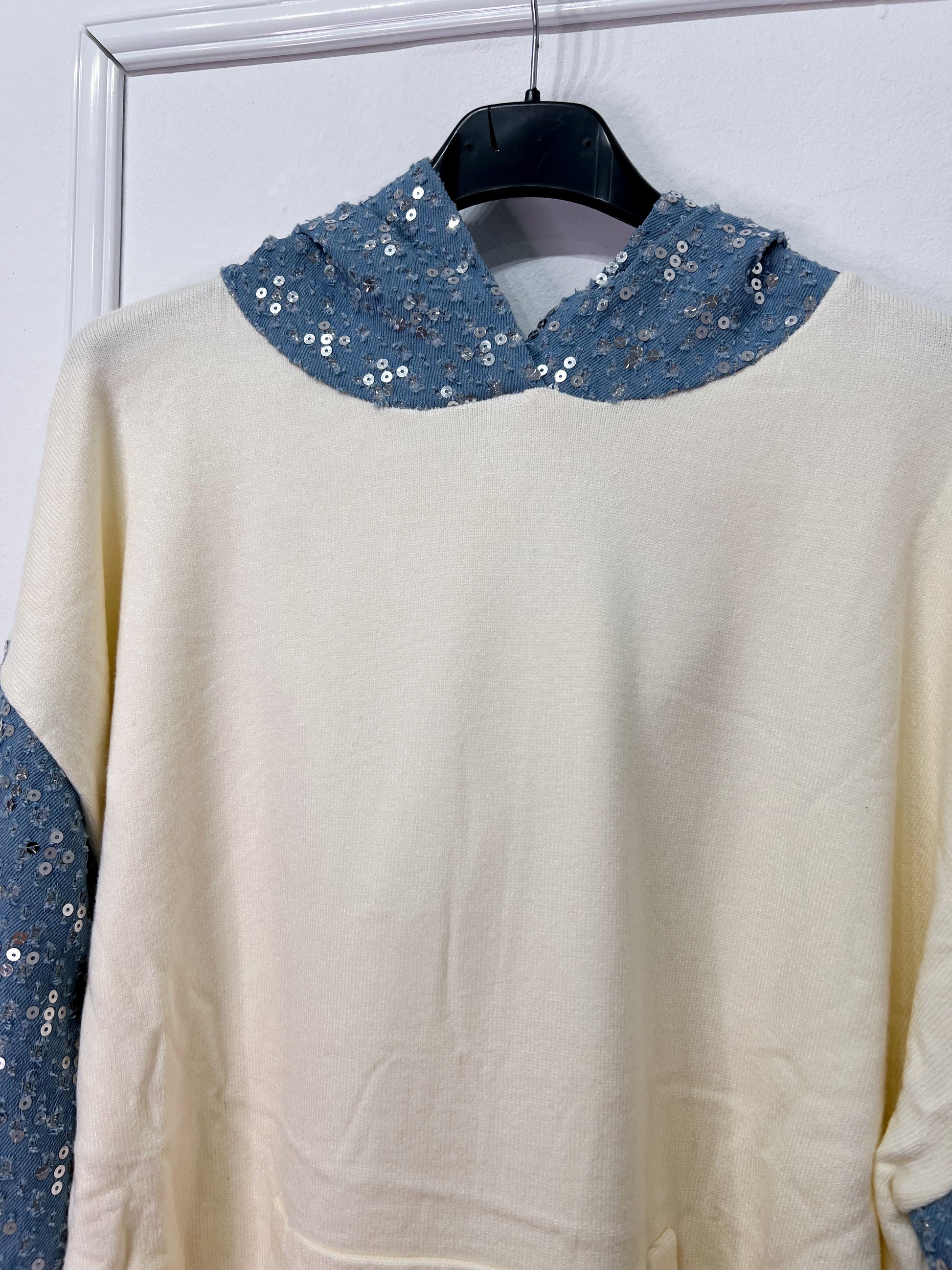 Maxi Jersey de punto grueso, con mangas y capucha en tela vaquera con lentejuelas, lleva bolsillo tipo canguro.