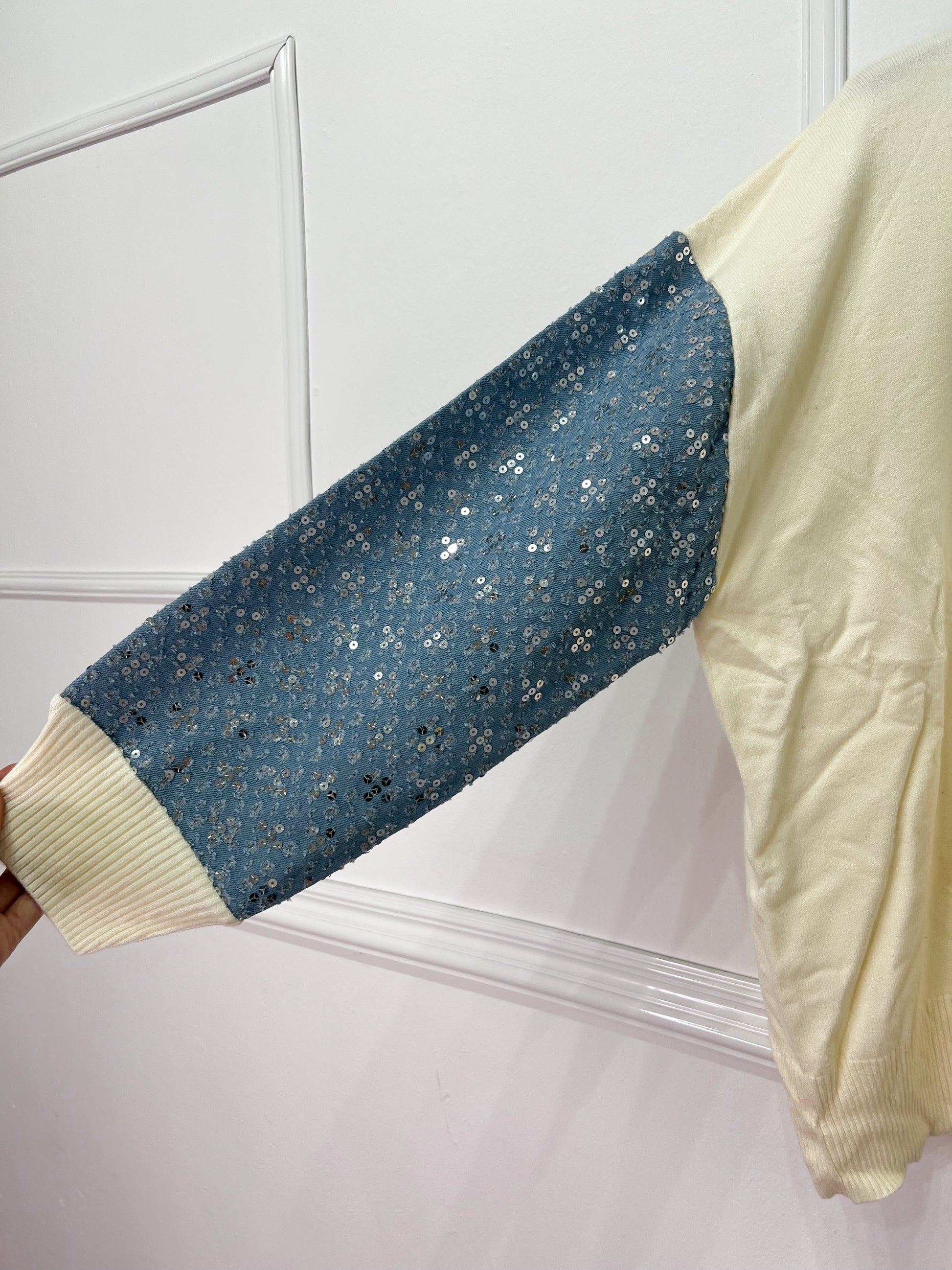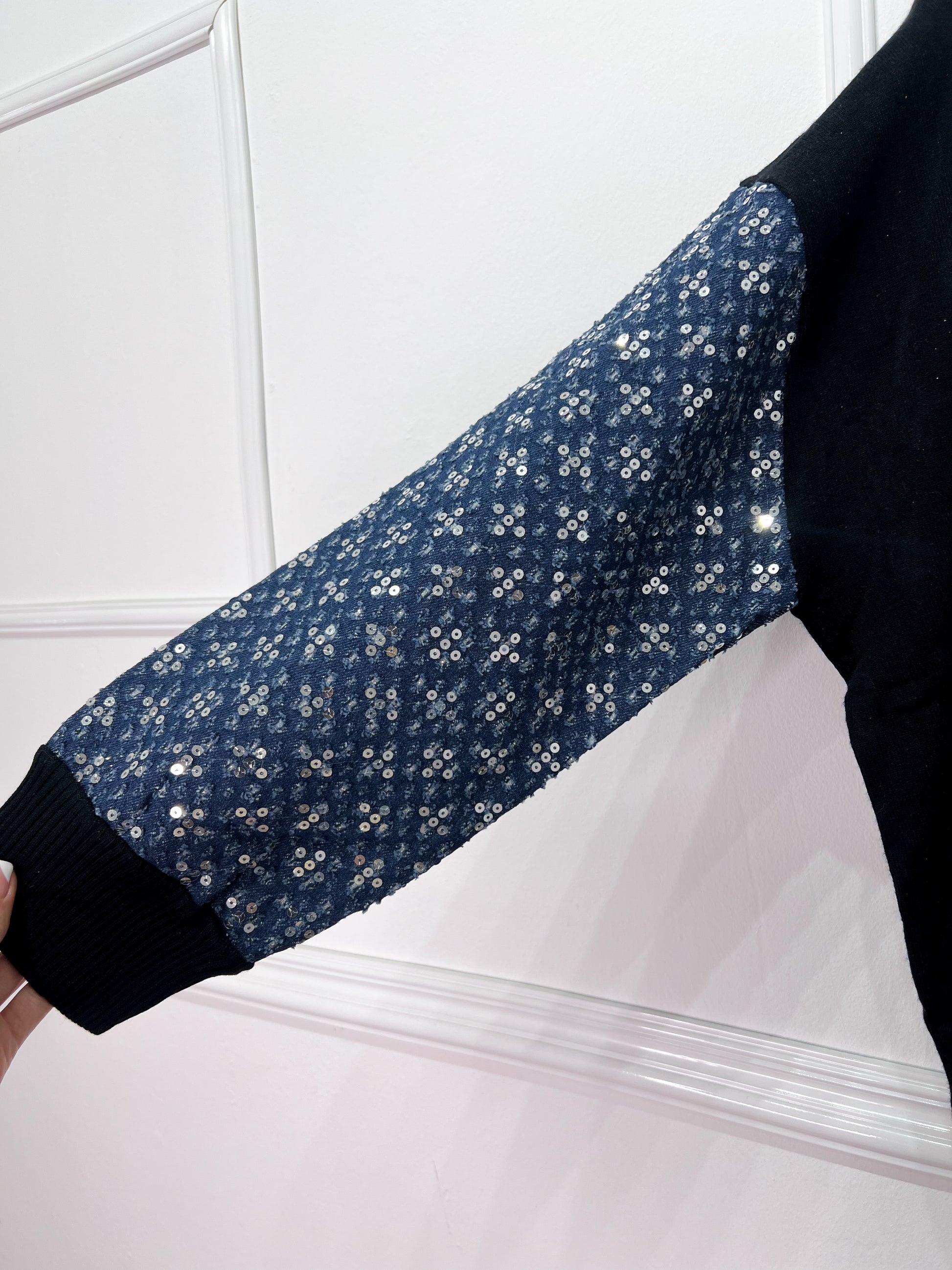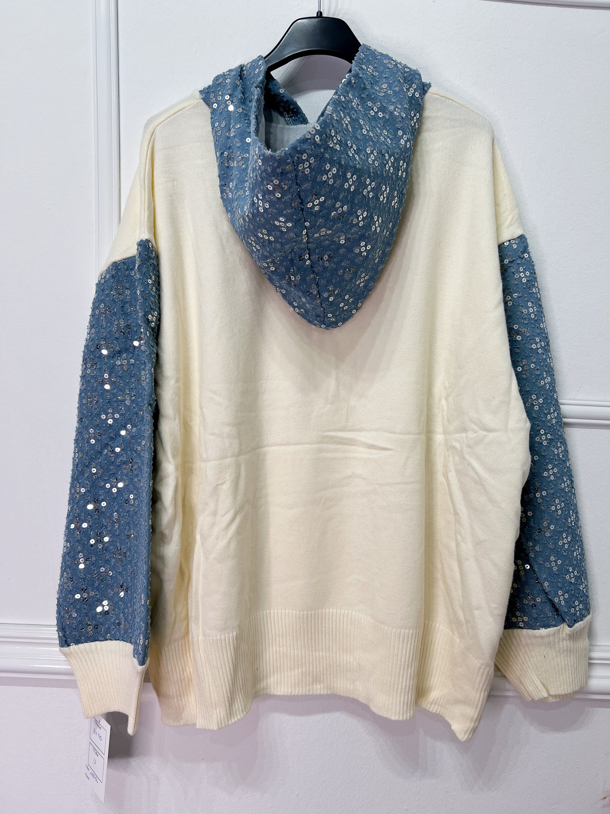Maxi Jersey de punto grueso, con mangas y capucha en tela vaquera con lentejuelas, lleva bolsillo tipo canguro.