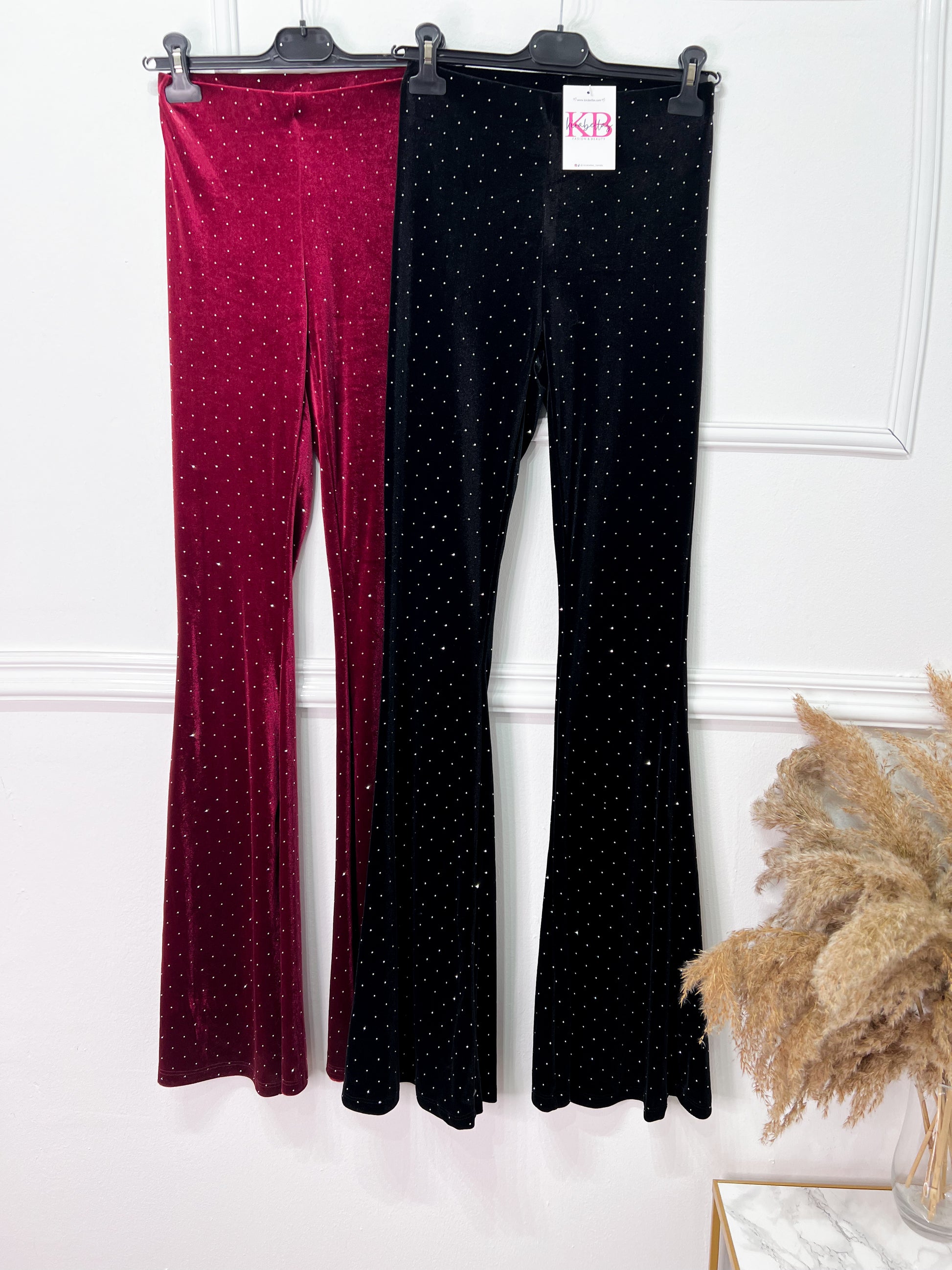 Pantalón acampanado de terciopelo entero de brillo, alto de tiro.