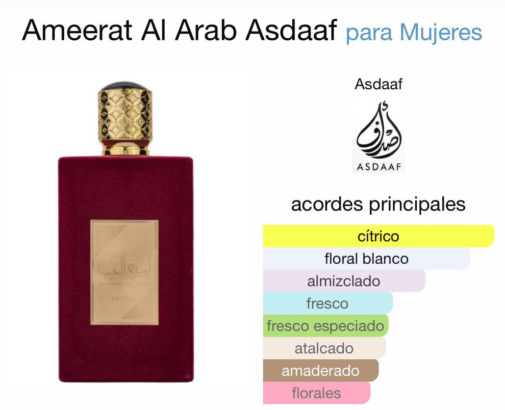 Asdaaf Ameerat Al Arab es una fragancia árabe que rinde homenaje a la majestuosidad, la elegancia y la riqueza de la cultura oriental.
