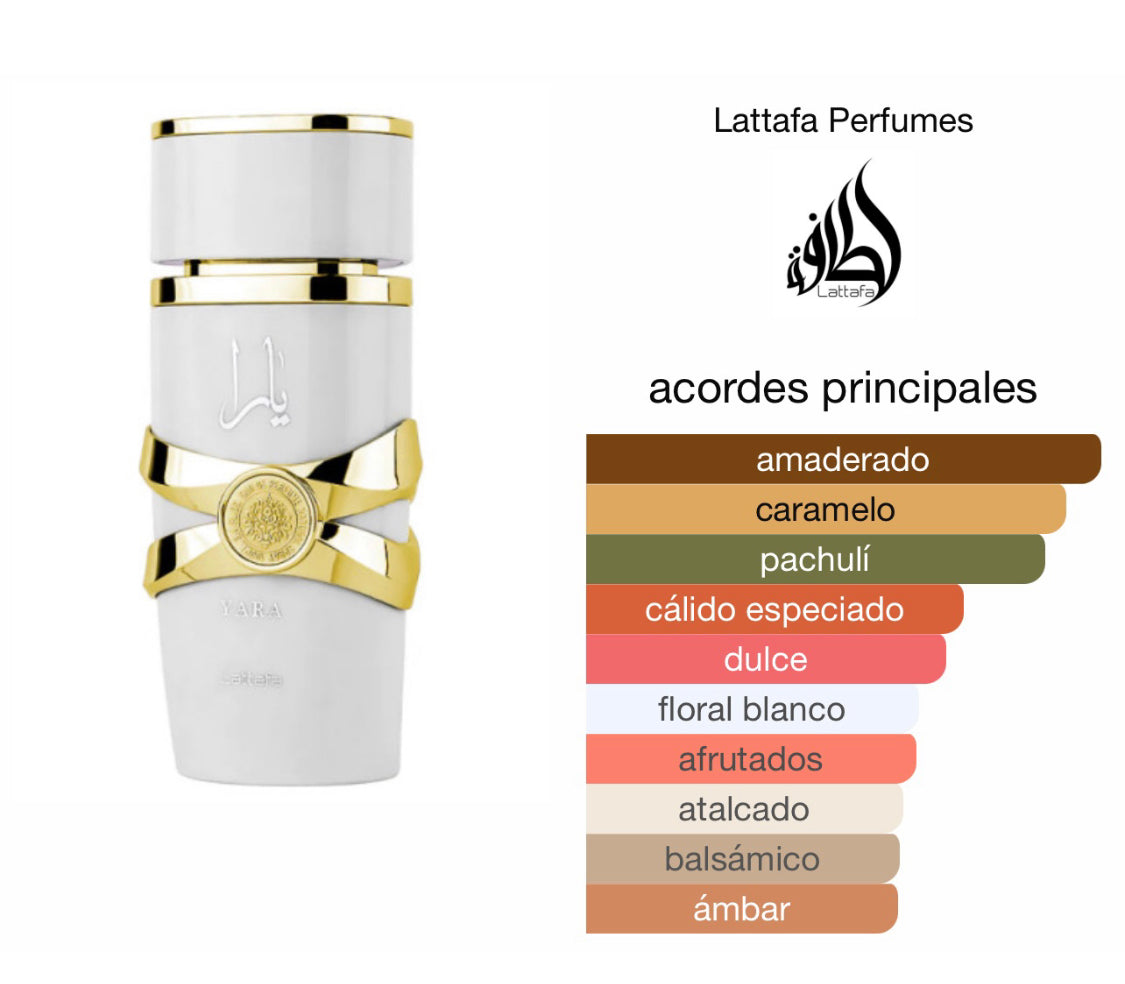 Yara Moi de Lattafa Perfumes, se abre con un soplo fresco y vibrante de jazmín y durazno, envolviéndote en una aura de dulzura y luminosidad. Esta apertura se funde en un corazón de ámbar y caramelo, creando una sensación embriagadora y tentadora que es absolutamente irresistible.